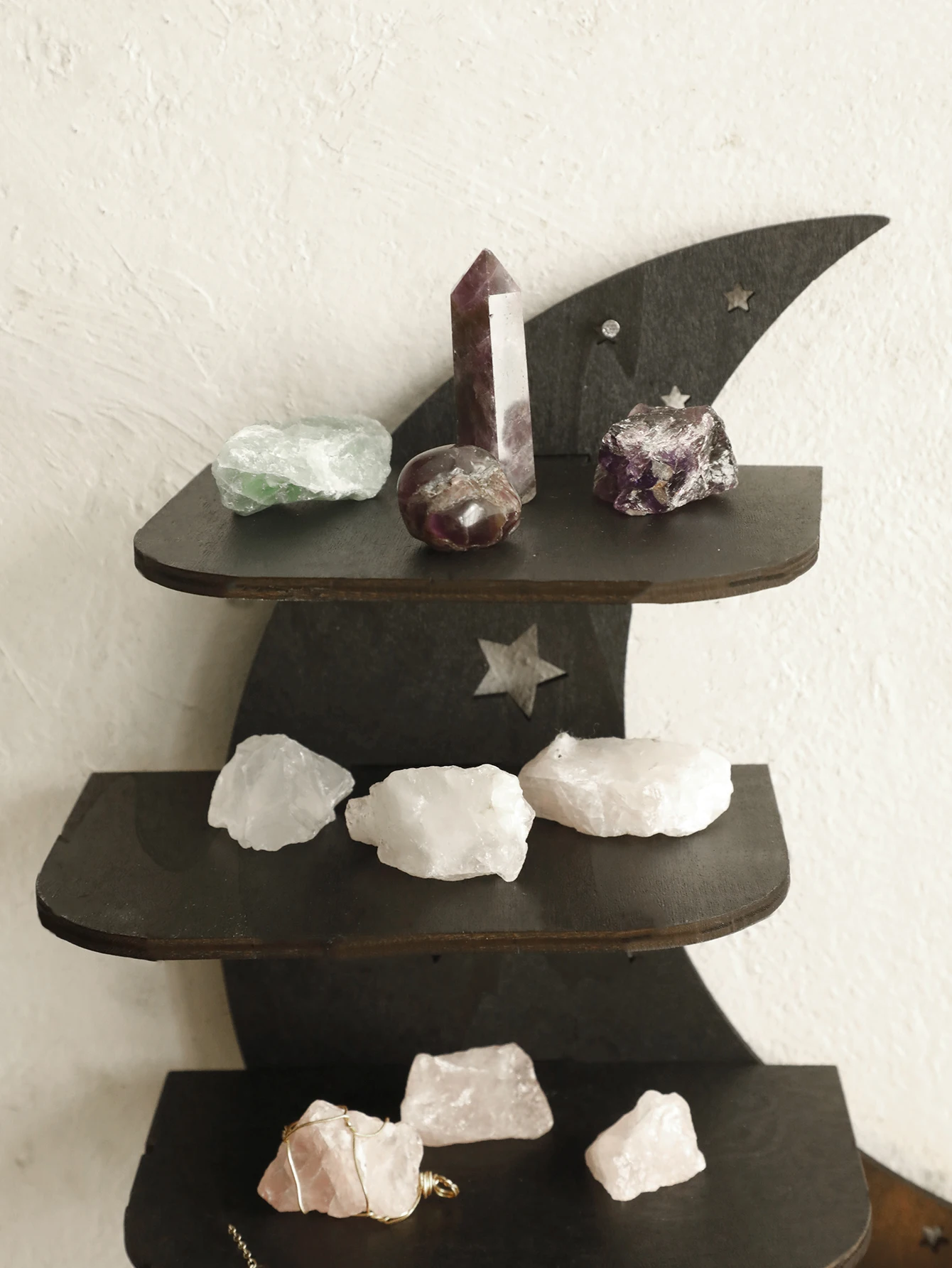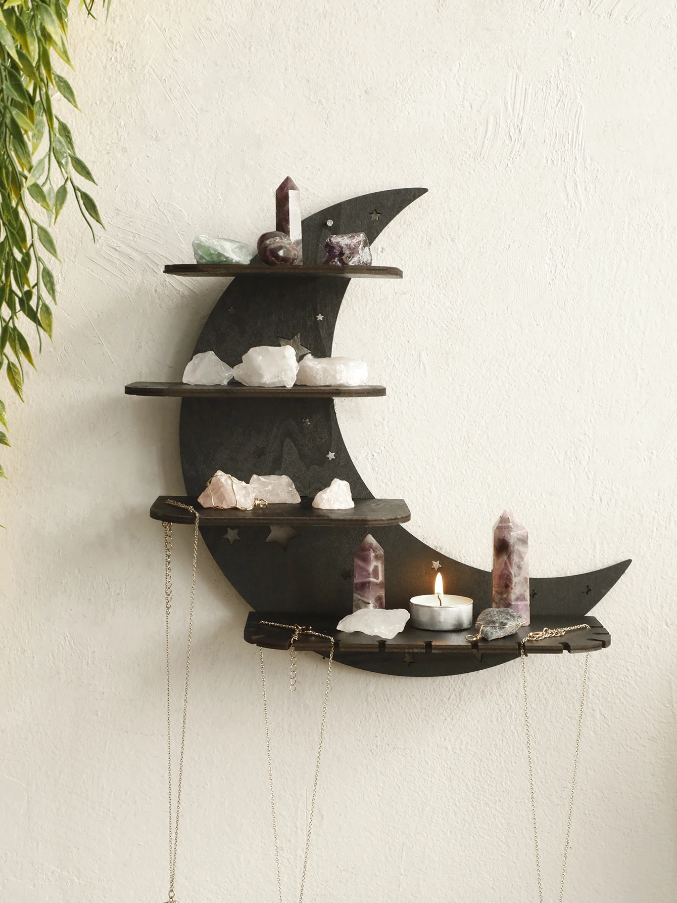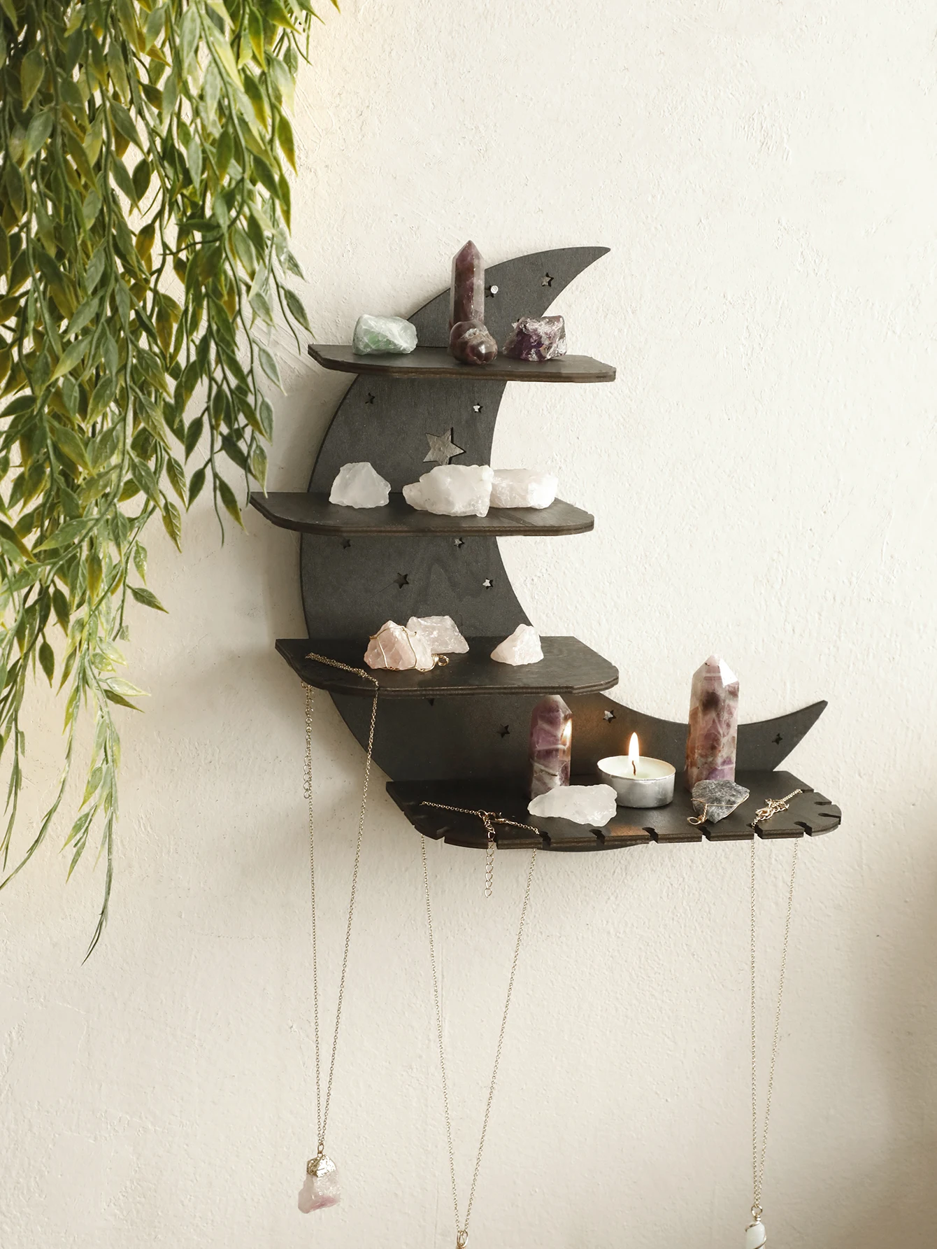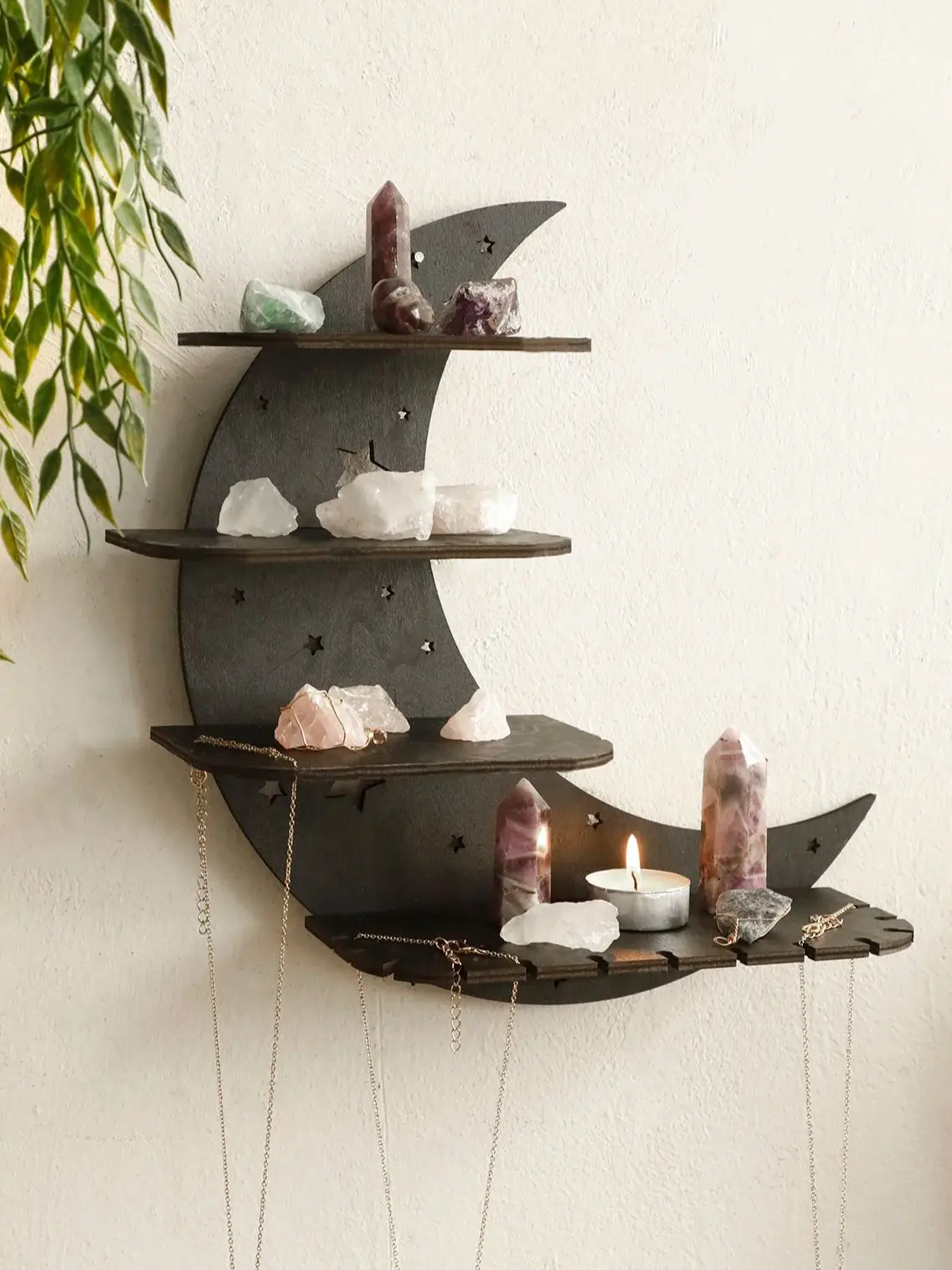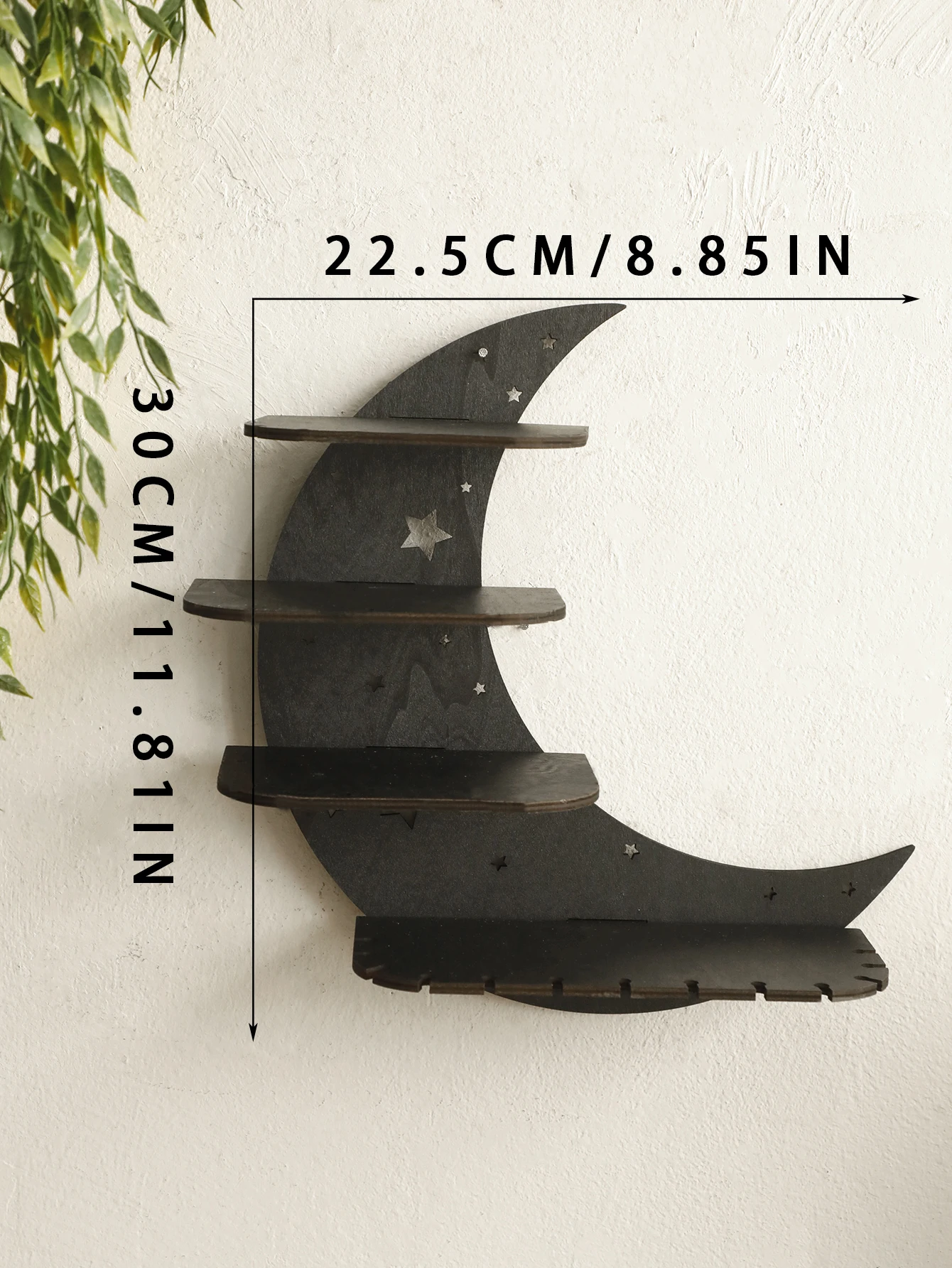 Display your favorite décor and keep your space organized with this Black Moon 4-tier floating wall shelf. Available in 30cm and 39cm sizes, it fits perfectly in various rooms and spaces. Crafted from high-quality wood, it offers durability and a sleek, modern look. The floating design provides a clean, minimalist aesthetic without visible brackets. Ideal for displaying books, plants, photo frames, or collectibles. Lightweight yet sturdy, each shelf can hold everyday decorative items with ease. Easy to install with included mounting hardware, it securely attaches to walls. Perfect for bedrooms, living rooms, kitchens, or offices, enhancing both style and functionality. Its unique black moon design adds a contemporary flair to any wall décor. Maximize your storage and elevate your interior design with this stylish and practical floating wall shelf.