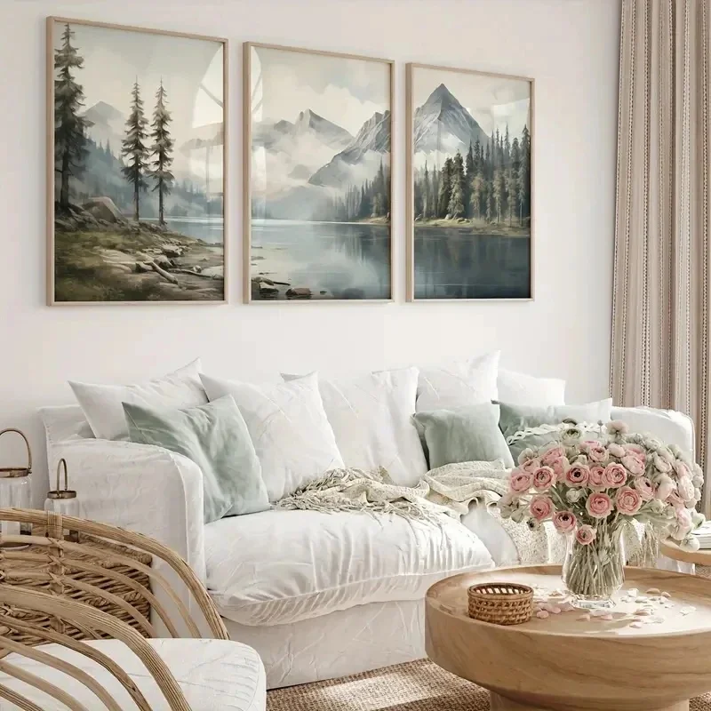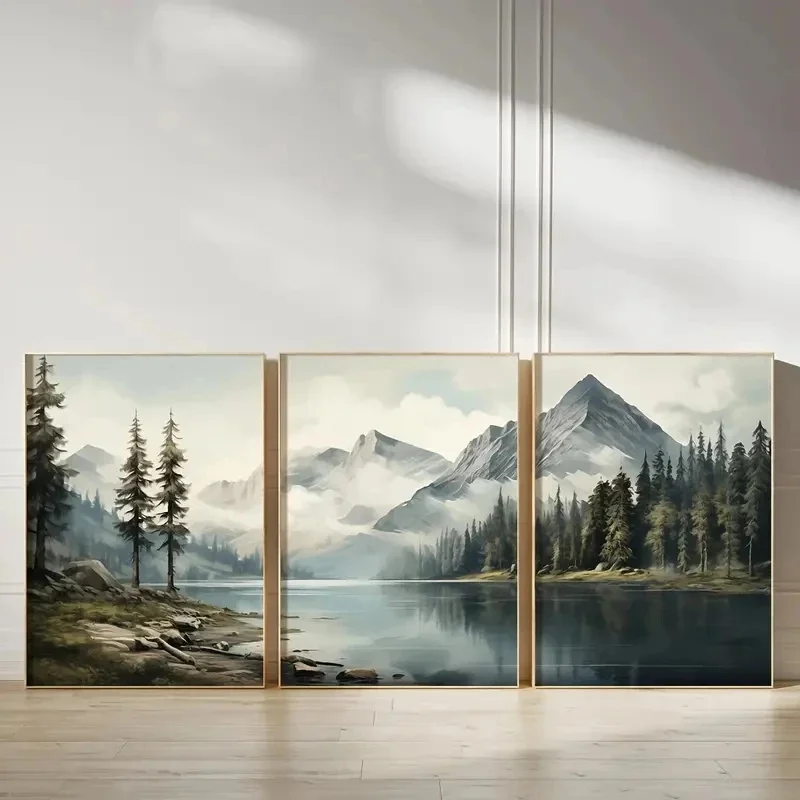 Bring serenity and natural beauty into your home with this 3-piece modern green landscape canvas set. Featuring mountains, lakes, and lush greenery in retro watercolor style, each piece exudes tranquility and charm. Printed on high-quality canvas, the colors remain vibrant and long-lasting. Ideal for living rooms, bedrooms, offices, or hallways, these paintings create a peaceful focal point. Lightweight and easy to hang, the set allows flexible wall arrangements. The combination of retro watercolor aesthetics and modern design complements a wide range of interior styles. Perfect for nature lovers and art enthusiasts looking to add a calming atmosphere to their space. Durable and visually striking, these canvases maintain their beauty o