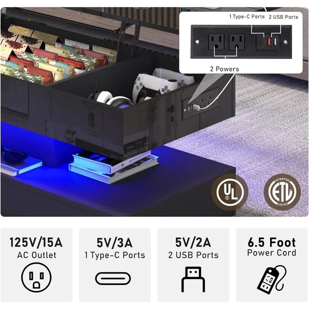 This 47.2″ large lift top coffee table combines modern design with practical functionality. Featuring a high-gloss black finish, it adds a sleek and luxurious look to any living room. Built-in LED lighting enhances the ambiance and creates a stylish centerpiece. The lift-top design provides hidden storage for books, remotes, or everyday essentials. Its spacious surface is perfect for drinks, décor, and entertainment needs. Crafted with durable materials, it ensures stability and long-lasting use. The storage compartments help keep your space organized and clutter-free. Ideal for both modern apartments and contemporary homes, it fits a variety of décor styles. Easy to assemble, it offers both convenience and elegance. Upgrade your living space with this multifunctional LED lift top coffee table.