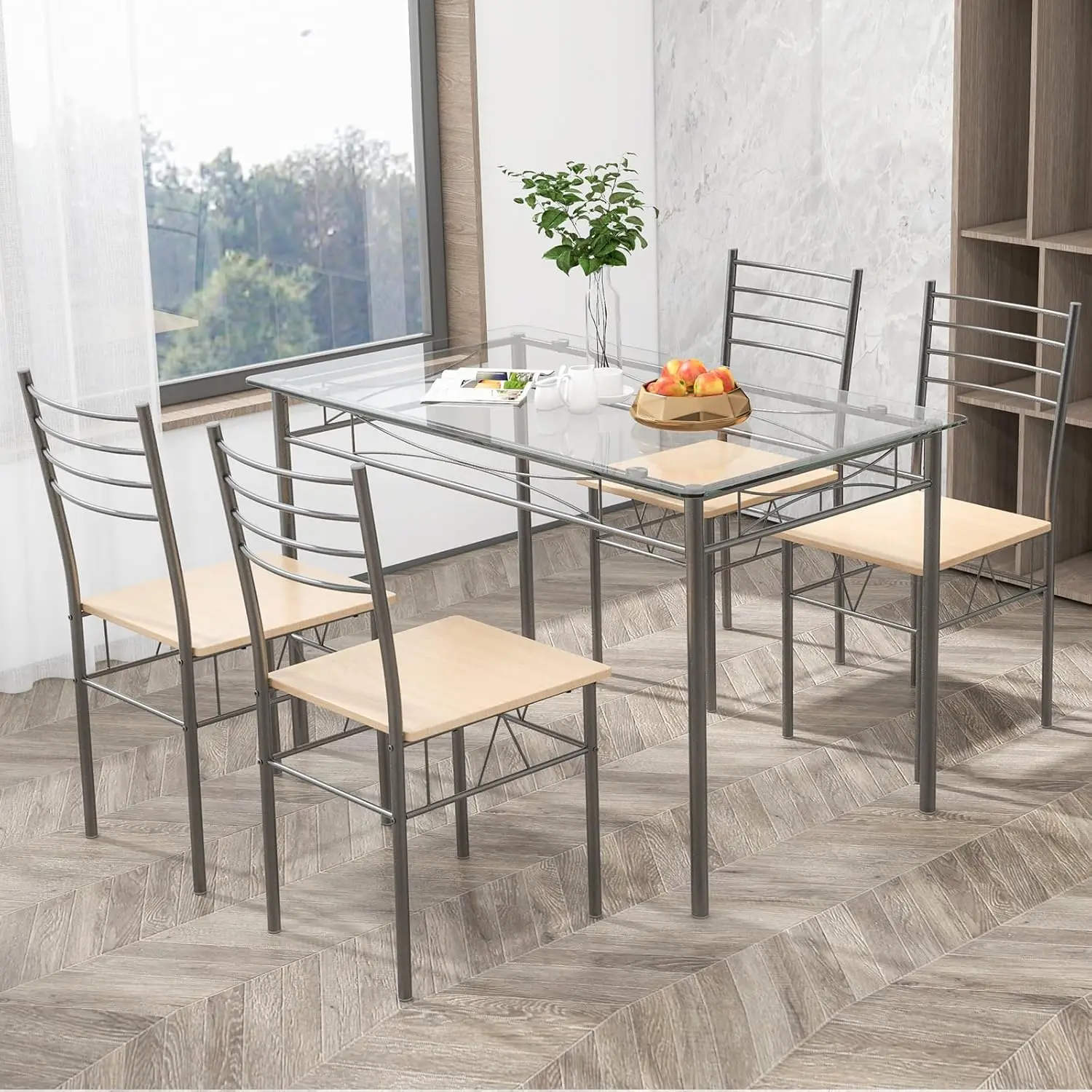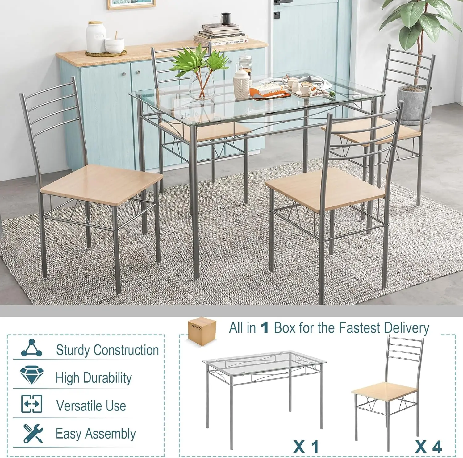 This 5-piece dining set features a sleek tempered glass table and four matching chairs.