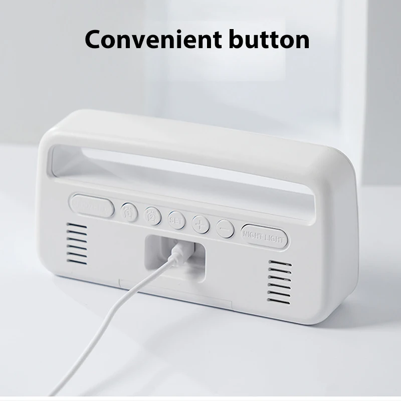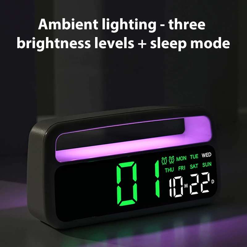 Stay on time while adding modern style to your space with this digital LED ambient light alarm clock. Featuring dual alarms, it’s perfect for couples or busy schedules, allowing two separate wake times in one compact design. The adjustable brightness function ensures a comfortable display day or night, while the soft ambient light doubles as a night lamp for a calming atmosphere. With a built-in sleep mode, it helps create a relaxing environment for better rest. The convenient handle makes it easy to move from room to room, making it ideal for bedrooms, offices, or travel. Its clear LED display shows time, date, and alarm settings at a glance, combining practicality with sleek contemporary design. Durable, portable, and stylish, this alarm clock is a reliable companion for everyday living.