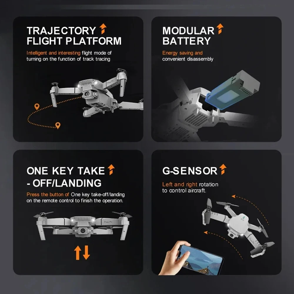 Take to the skies with the E88 RC Drone, equipped with a 1080P wide-angle HD camera for stunning aerial photography. Its foldable design makes it compact and easy to carry, perfect for travel and outdoor adventures. The professional-grade drone offers stable flight and precise control for beginners and experienced pilots alike. Capture sharp and detailed images or record high-definition videos from above. Lightweight yet durable, it withstands outdoor conditions and ensures reliable performance. The drone features multiple flight modes for versatile flying experiences, including altitude hold, headless mode, and one-key return. Ideal for exploring landscapes, creating cinematic footage, or enjoying recreational flying. Perfect as a gift for drone enthusiasts, hobbyists, or photographers. Easy to operate with intuitive controls and responsive handling. Elevate your aerial photography and enjoy the thrill of flight with the E88 RC Drone.