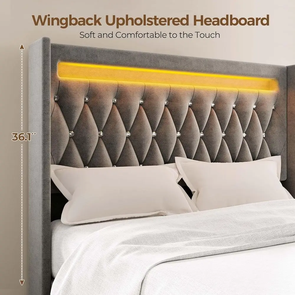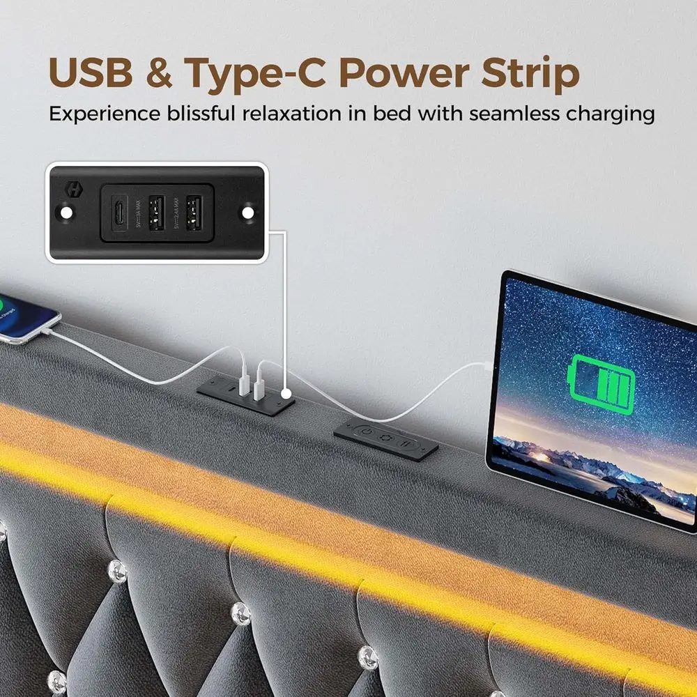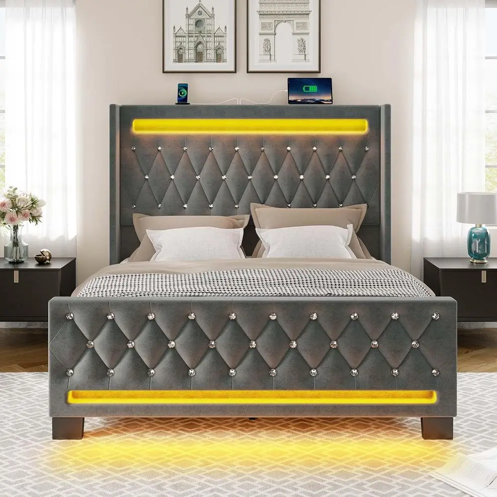 Upgrade your bedroom with this grey LED light queen bed featuring a built-in charging station.