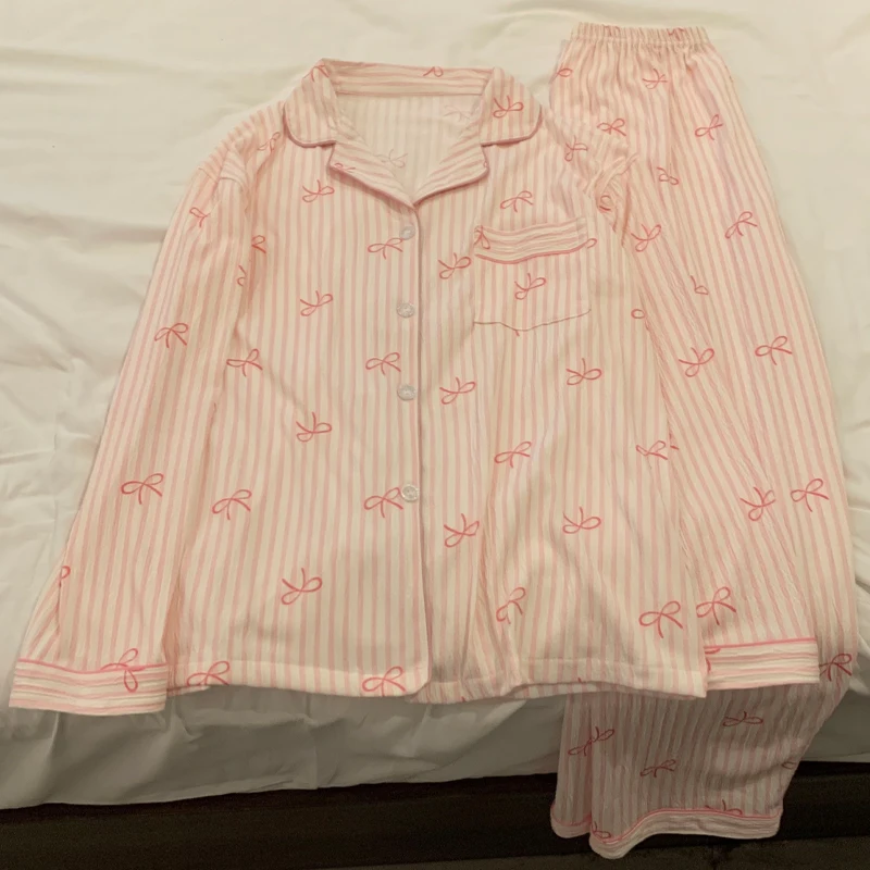 Sleep in style and comfort with this charming pink bow tie pajama set for women. The set features a long-sleeve top adorned with an elegant bow tie design, adding a cute and feminine touch. Elastic waist pants provide a flexible fit for all-day comfort and relaxation. Crafted from soft, breathable fabric, it keeps you cozy without feeling heavy or restrictive. The playful pink color brightens your nighttime wardrobe while remaining versatile for everyday wear. Perfect for lounging at home, bedtime, or weekend relaxation. The long sleeves and full-length pants ensure warmth during cooler nights. Lightweight yet durable, this set maintains its softness and color wash after wash. This 2-piece set makes a delightful gift for friends, family, or yourself. Easy to care for and stylish to wear, it combines functionality with charming aesthetics.