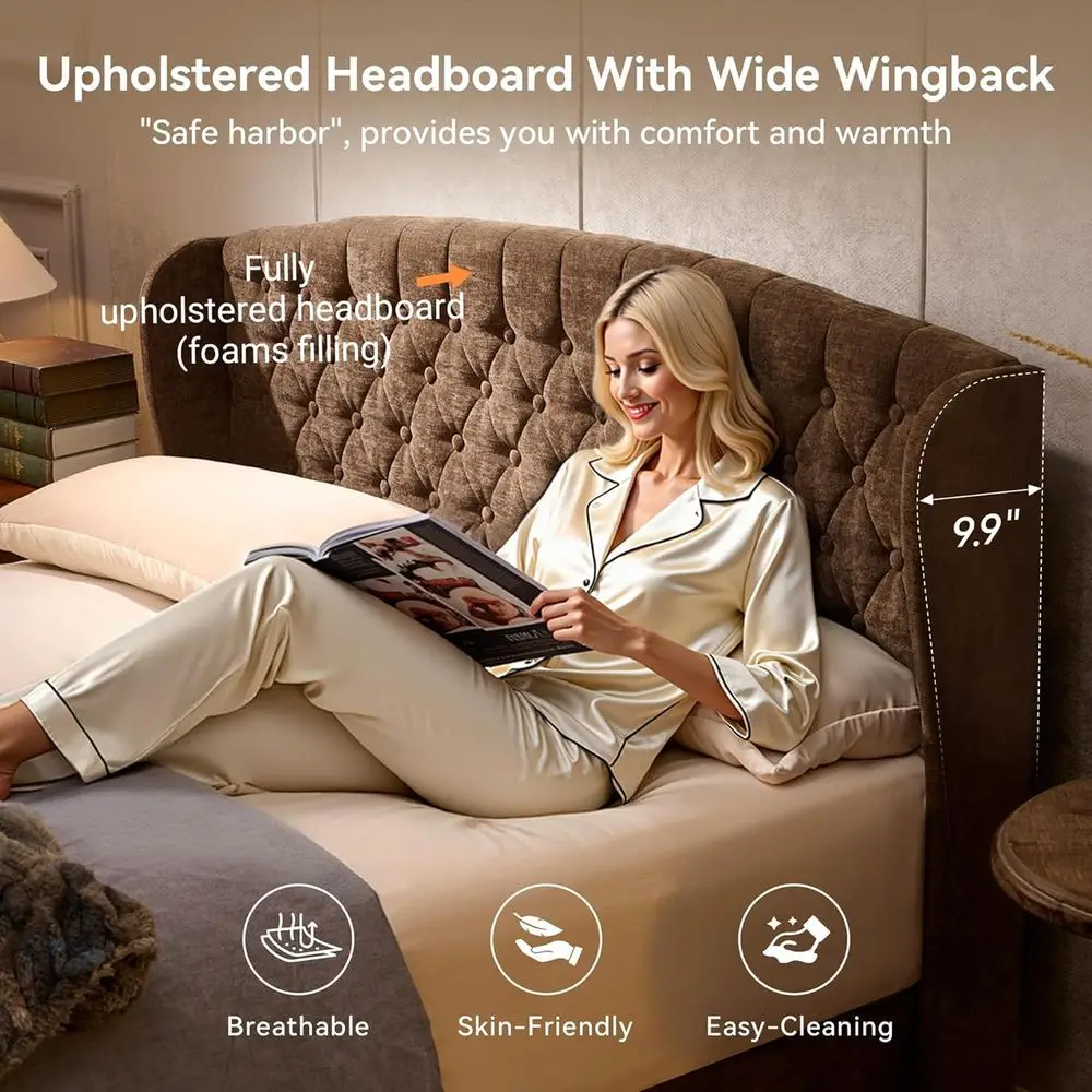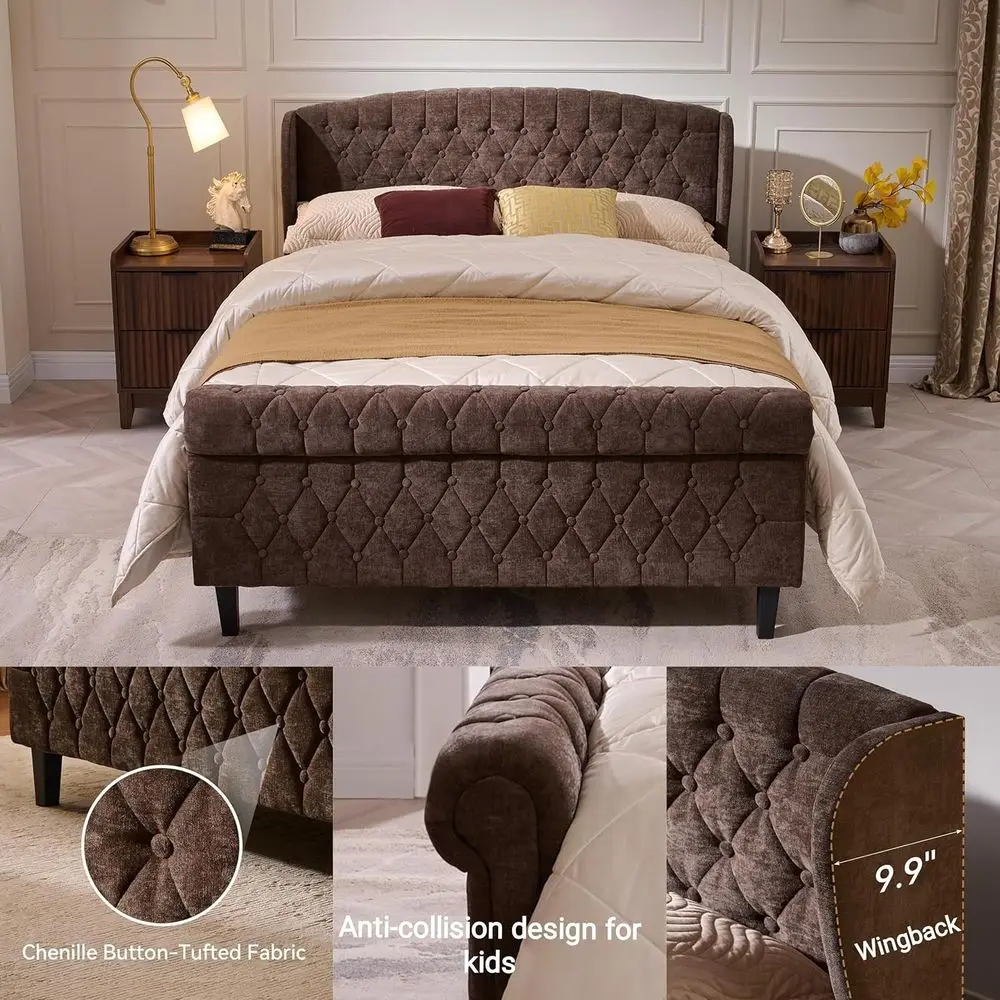 Add timeless elegance to your bedroom with this vintage brown upholstered queen sleigh bed. Featuring a graceful sleigh silhouette, it brings classic charm and refined style to any space. The velvet scroll footboard adds a luxurious touch while enhancing the bed’s traditional design. Soft upholstery offers a warm, inviting look and a comfortable feel. Crafted with a sturdy frame, this bed provides reliable support and long-lasting durability. The gently curved headboard and footboard create a cohesive, sophisticated aesthetic. Its rich brown tone complements both vintage and modern décor styles effortlessly. Designed for a queen-size mattress, it offers ample sleeping space without overwhelming the room. This sleigh bed serves as a stunning centerpiece for master or guest bedrooms alike. Perfect for those who appreciate classic design with a touch of luxury, it elevates your sleeping space instantly.